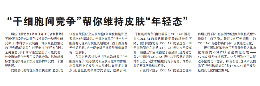 科技日報(bào)北京4月3日電(記者張夢然)英國《自然》雜志3日在線發(fā)表的一項(xiàng)老化研究稱,日本科學(xué)家發(fā)現(xiàn)由一種膠原蛋白驅(qū)動(dòng)的“干細(xì)胞…
