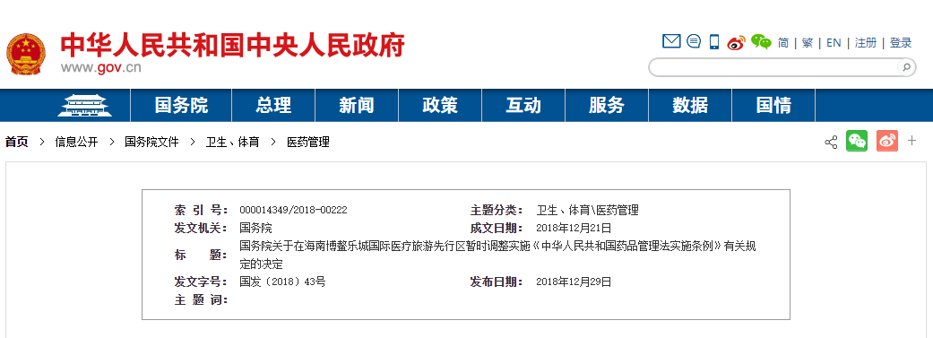 近日,國務(wù)院發(fā)布《關(guān)于在海南博鰲樂城國際醫(yī)療旅游先行區(qū)暫時調(diào)整實施<中華人民共和國藥品管理法實施條例>有關(guān)規(guī)定的決定》。國務(wù)院決定,在海南博鰲樂城國際醫(yī)療旅游先行區(qū)暫時調(diào)整實施《中華人民共和國藥品管理法實施條例》第三十六條的規(guī)定,對先行…