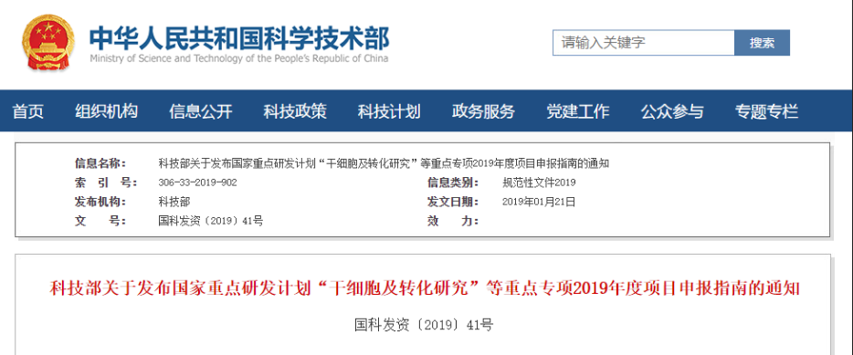 2019年1月21日,我國科技部官網(wǎng)正式發(fā)布了“干細(xì)胞及轉(zhuǎn)化研究”重點專項2019年度項目申報指南,指南中明確:在之前已支持98個項目的基礎(chǔ)上,2019年國家再撥款4億元,支持12個干細(xì)胞研究方向。其中干細(xì)胞資源庫、干細(xì)胞治療性腺衰老也寫入申報指南。指南中明確…